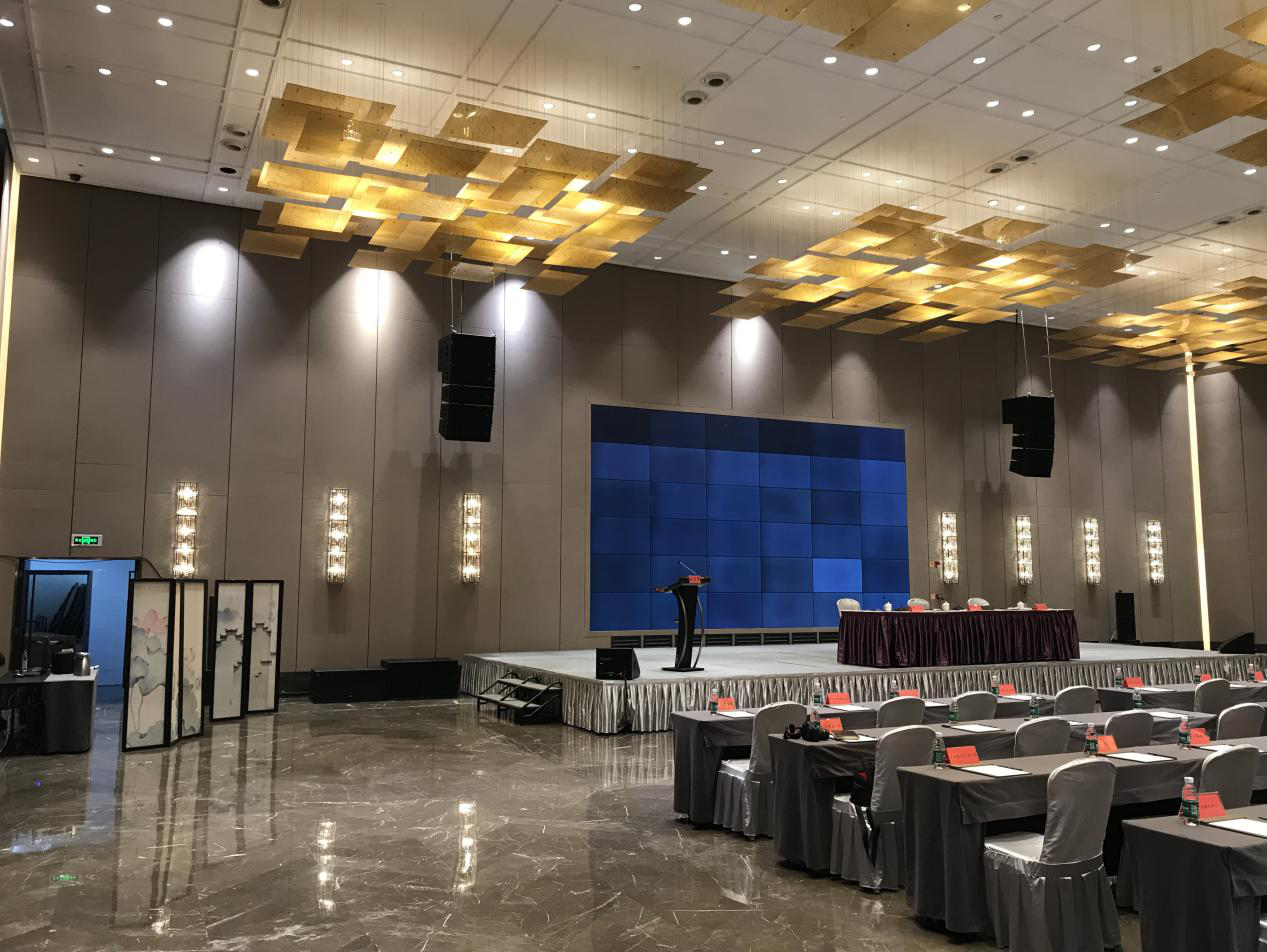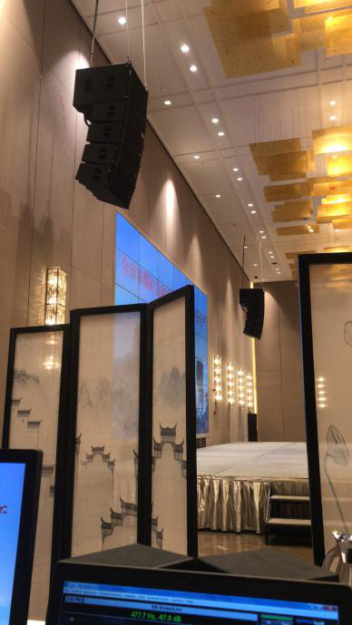 酒店牡丹廳為729平米,高8米無柱宴會廳,配置了雙十寸線陣列音箱,與演出級別專業(yè)功放、搭配英國品牌Studiomaster的Digileve系列前級處理系統(tǒng),組成一套完美音效、人聲表現(xiàn)突出的高端擴聲系統(tǒng)。工程達到極高標準,為酒店搭建起一套設備先進、性能穩(wěn)定可靠專業(yè)擴聲系統(tǒng),得到使用方的一致好評!